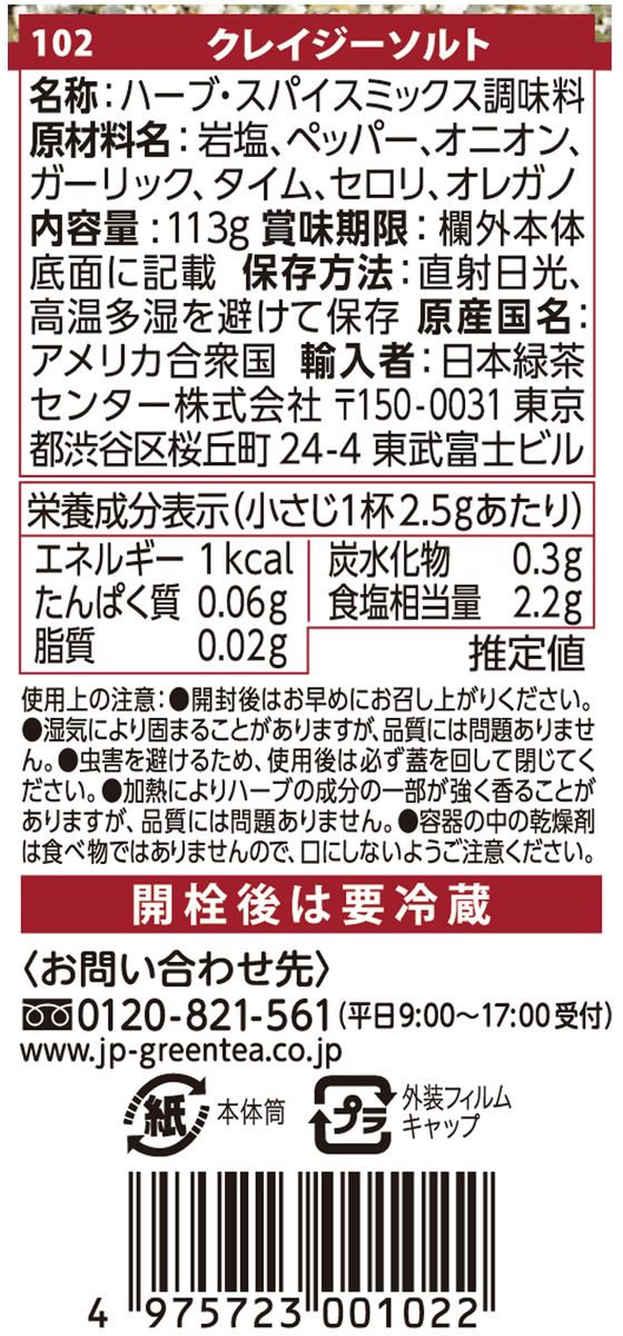 【検索用キーワード】ニホンリョクチャセンター くれいじーそると 113g スパイスミックス ミックスソルト ハーブ 岩塩 ペッパー オニオン ガーリック セロリー タイム オレガノ 1本 調味料 ちょうみりょう 万能調味料 ハーブ調味料 肉料理 魚料理 卵料理 サラダ 無添加 無着色 無香料 RPUP_02ひと振りでシェフの味。