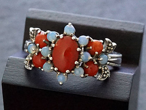 【Rokuzan/碌山】 Silver925/地中海珊瑚(7x5mm)/オパール アンティークデザイン/リング