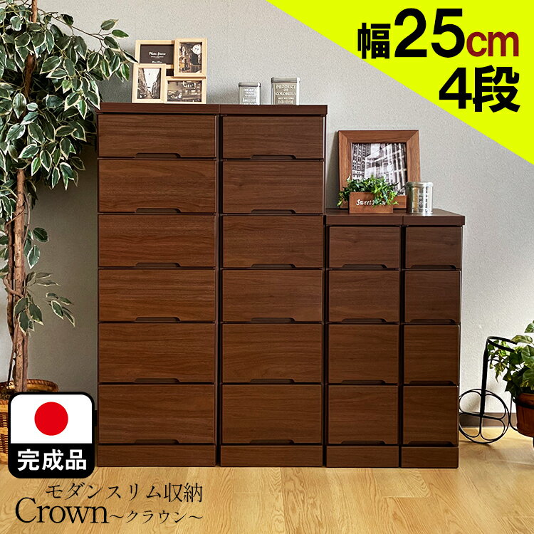 隙間収納 25cm 完成品 国産 (幅25/4段クラウン) 【すきま収納 25cm 引き出し ランドリー収納 洗面所 リビング 隙間ラック ブラウン チェスト すき間収納 隙間 収納 サニタリー 棚 小物 キッチン スリムチェスト 木製 日本製 モダン スリムラック 大川家具 おしゃれ 】