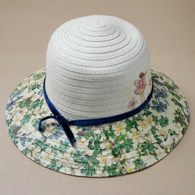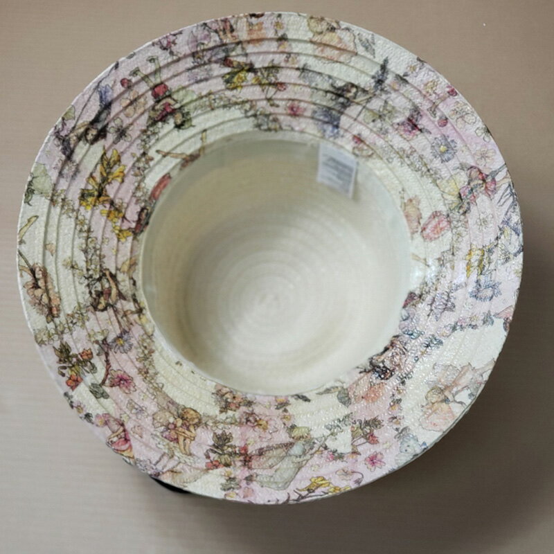 ●商品名 麦わら帽子 白バラと青い花柄 内側 ベビーピンクのフェアリー柄 ●サイズ 縦横約33cm、高さ約21cm デコラティブ(デコハット)は各種素材の鍔つきハットに欧州のカラフルで洗練されたペーパーナプキンをデコパージュの技法で施した帽子です。