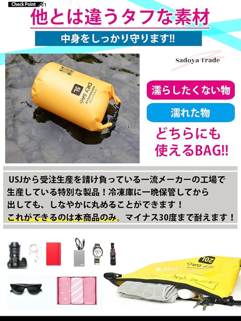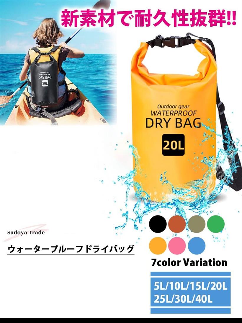 夏でも冬でも、海でも山でも、一年中タフに使える防水バッグ・ドライバッグ・プールバッグをご用意しました素材は0.5mmの厚みの第3世代素材「Soft Coating 500D PVC Tarpaulin 改良版」使用・従来の第2世代素材「Coating PVC 」がゴワゴワして丸めにくいという欠点を解消・プラス70度からマイナス30度までしなやかさを確保・ヘビーデューティに防水バッグをお使い頂きたい方には最適な商品・本商品は暑い夏でも寒い冬でも安心してお使い頂けます「セット」防水ドライバッグ+スマホ用防水スマホケース(ポーチ、IPX8性能、外から操作可能)・「サイズ」2L、5L、10L、20L、25L、30L・「材質」第3世代PVC(Ultra-SoftCoating500DPVCTarpaulin)2018改良版・使用後は汚れたバッグは石けんやブラシで外側と内側を洗い、水分を拭いてしっかりと乾燥させて下さい。