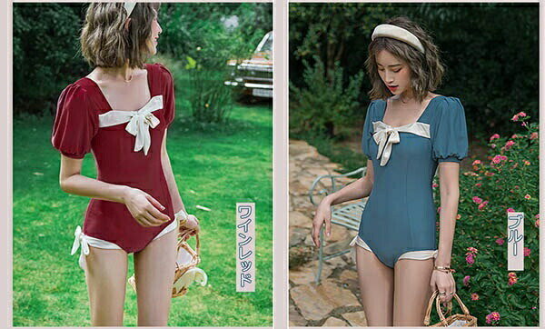 水着 体型カバー ワンピース リボン スカート バックシャン ワイヤー有り パッド付 大きいサイズ ハイウエスト レディース 温泉 かわいい セクシー 韓国風 大人 女性用 ワインレッド 青