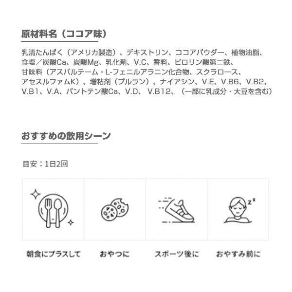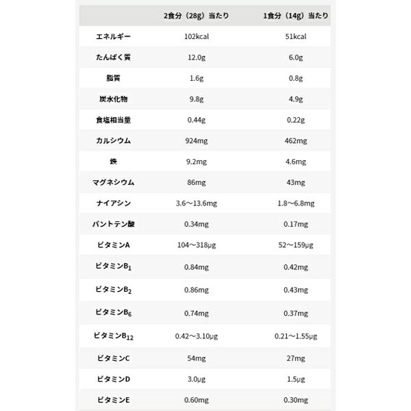 1日あたりの栄養素等表示基準値に対する充足率:33% お召し上がり方ココア味は牛乳または水150mlに、付属のスプーン2杯(約14g)を溶かす。