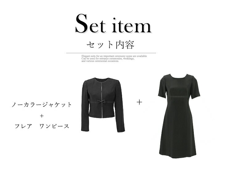 ブラックフォーマルアンサンブルの詳細 ジャケット ・ノーカラージャケット ・長袖 ・フロントホック式 ・スリットカフス仕様 ・リボンブローチ ・裏地付き ワンピース ・フレアワンピース ・レギュラー丈 ・半袖 サイズ 5号・7号・9号・11号・13号・15号・17号・19号・21号・23号 小さいサイズ〜大きいサイズ(ラージサイズ)。