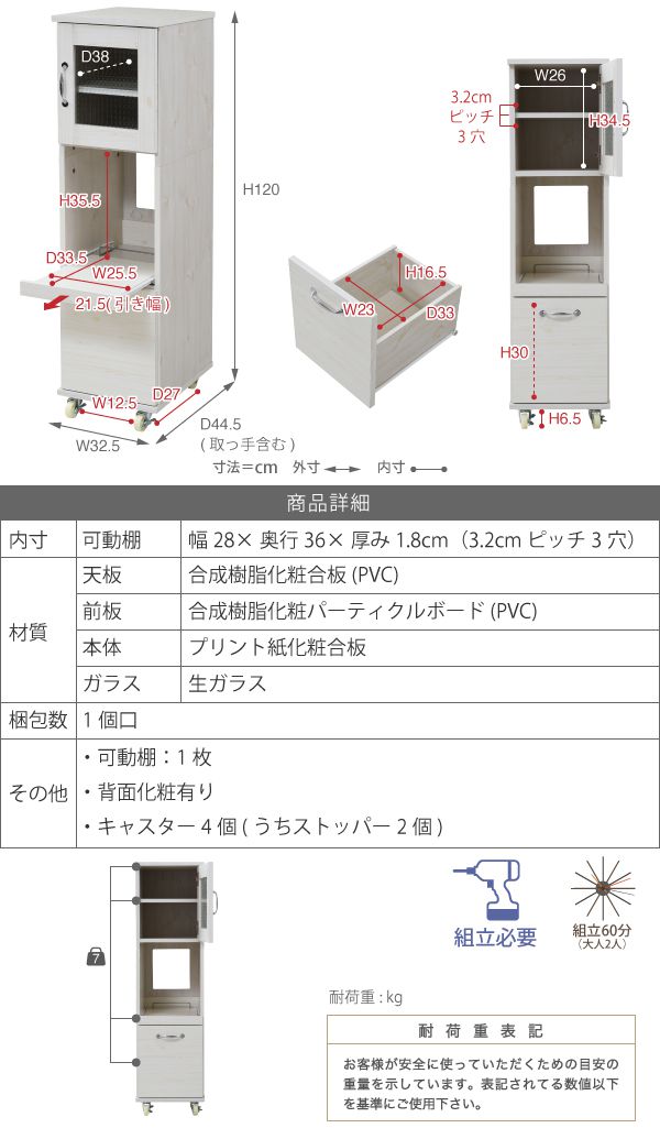 幅32.5×奥行44.5×高さ120cm[内寸]:(スライド部)幅25.5×奥行33.5×高さ35.5cm(スライド引き幅)21.5cm(扉内)幅26×奥行38×高さ34.5cm(引き出し)幅23×奥行33×高さ16.5(有効30)cm(可動棚)幅28×奥行36×厚み1.8cm(3.2cmピッチ3穴)[天板]合成樹脂化粧合板(PVC)[前板]合成樹脂化粧パーティクルボード(PVC)[本体]プリント紙化粧合板[ガラス]生ガラス[天板]約7kg以下[スライド]約7kg以下[可動棚]約7kg以下[引き出し]約7kg以下・可動棚:1枚・背面化粧有り・キャスター4個(うちストッパー2個)生産国:中国大人2人での組立時間(目安):60分・備考仕上げ加工の性質上、商品パーツごとに色味が若干異なる場合がございます。
