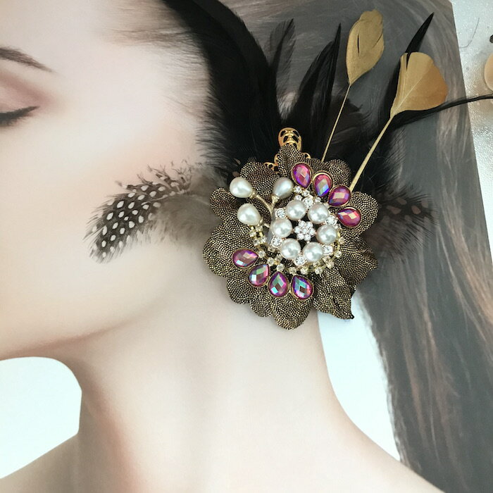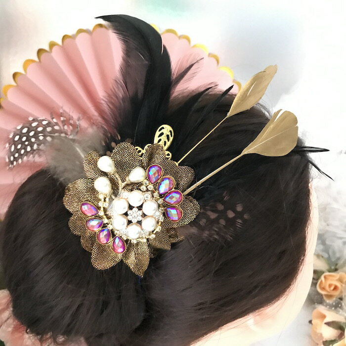 ヘア飾り ヘッドコサージュ ヘアアクセサリー ヘッドピース コサージュ 羽根付き フェザー ヘッドドレス ダンス衣装 髪飾り ヘアアクセサリー 社交ダンス 衣装 ブローチ ゴールデンブロンズ ブラウン系 ブラック