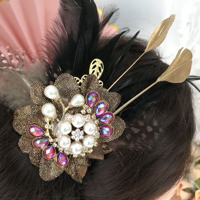 フェザー、パールとラインストーン付きの ヘアアクセサリーになります。