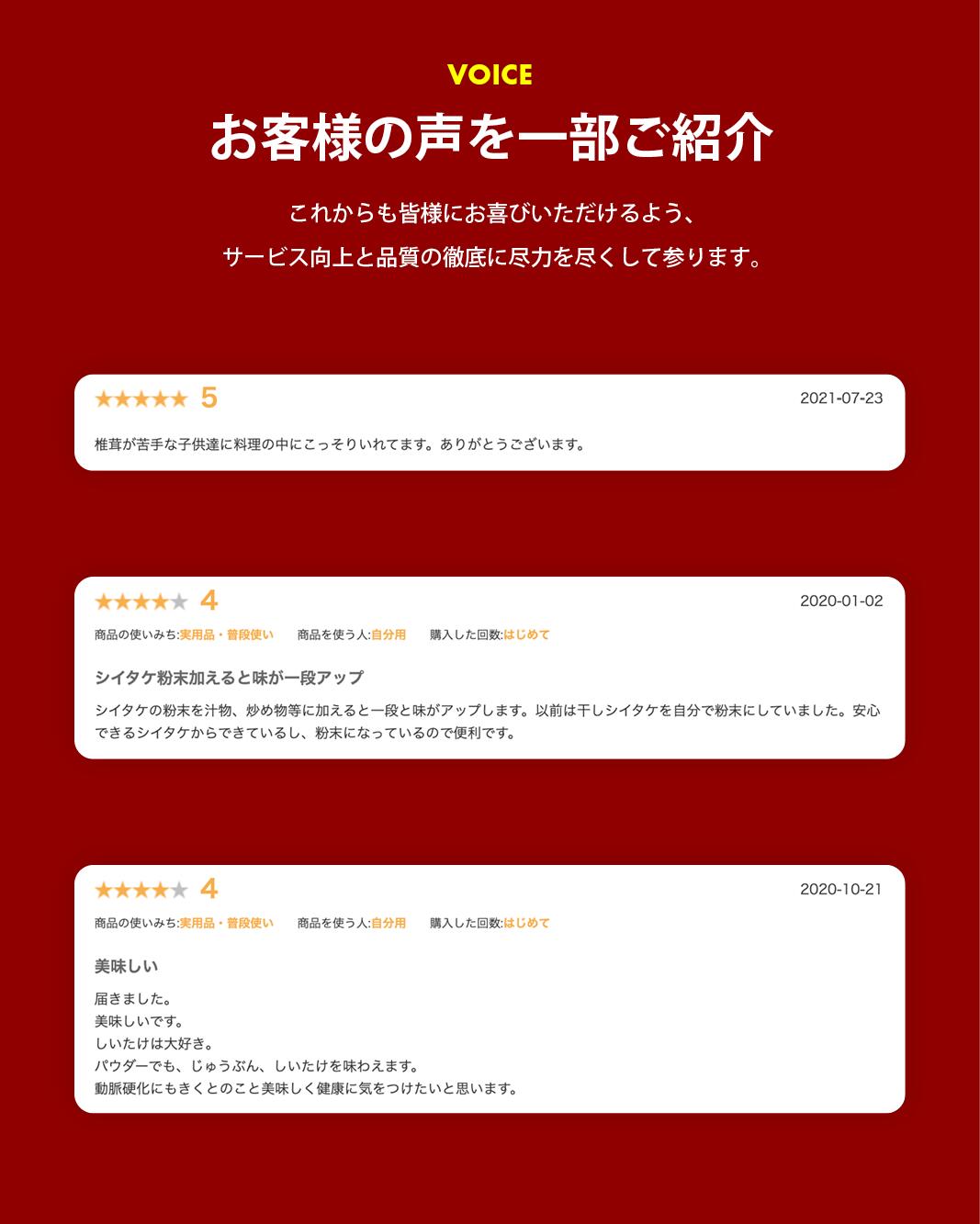 商品情報 商品説明 国産で無添加(化学調味料は不使用)の干し椎茸を微粉末にした椎茸の粉です。